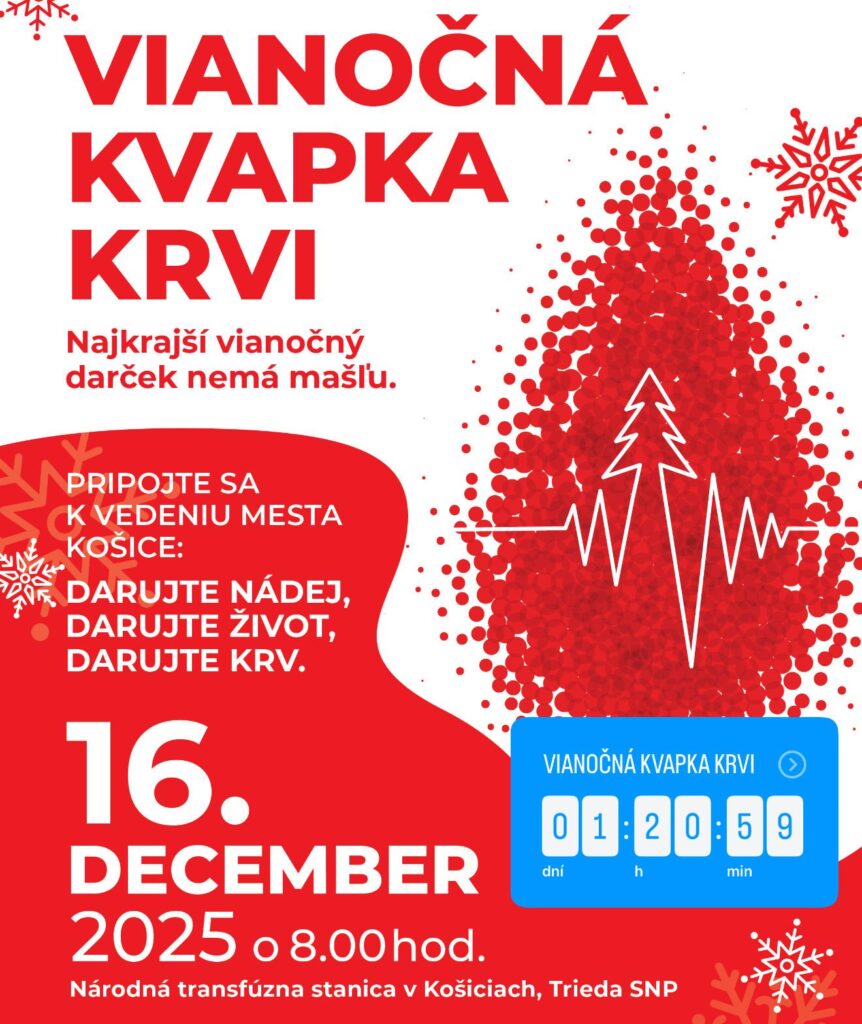 Ani tento rok v Košiciach nemôže chýbať Vianočná kvapka krvi. V utorok 16. decembra môže každý, kto si nájde čas a komu to zdravotný stav dovoľuje, pomôcť svojou „kvapkou“. Jeden odber krvi môže zachrániť až tri ľudské životy.